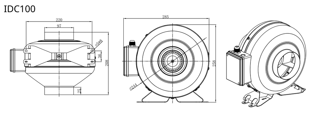 STERR IDC100 - 100 mm Centrifugaalventilator, Duurzame metalen behuizing, 262 m³/h, 51 W