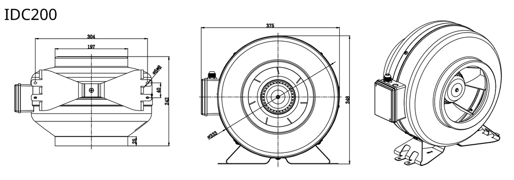 STERR IDC200 - 200 mm Centrifugaalventilator, Duurzame metalen behuizing, 945 m³/h, 175 W